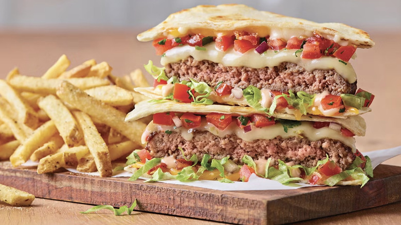 Somewhat of a strange combo to begin with, the Quesadilla Burger at Applebee's is, unfortunately, not really worth writing home about. Made with Mexi-ranch sauce, Applewood-smoked bacon, lettuce, pico de gallo, and Pepper Jack cheese, this behemoth of a burger typically generates a somewhat tepid online opinion. For longtime Applebee's fans, the Quesadilla Burger partially represents a decline in taste and service. While not completely inedible, customers think it's nothing more than another so-called burger, which is likely not the opinion Applebee's intends to generate.