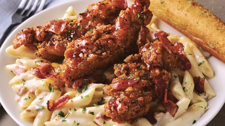 The Four Cheese Mac & Cheese With Honey Pepper Chicken Tenders at Applebee's is a relatively new selection for guests wanting something a bit outside the norm. Topped with bacon and chicken tenders, this "sweet and savory" penne mac and cheese is tossed in honey pepper sauce and cooked with four different cheeses. Based on reviews, however, the Four Cheese Mac & Cheese comes out of the kitchen ready to disappoint, particularly for customers craving the robust meal showcased on the Applebee's menu. Customers cite an overall lack of cheese compounded by honey pepper sauce drizzled over the poultry. Reportedly bland, the pasta's sauce clearly did not win any points for taste or even edibility.