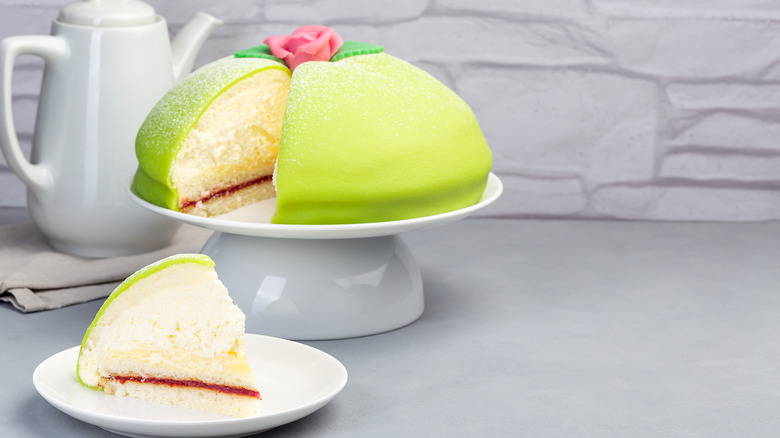 Yep, it's another royal cake. This time, as the name implies, the Swedish Princess Cake was beloved by three princesses, Margaretha, Märtha, and Astrid of Sweden. It was developed for them by home economist Jenny Akerström, who taught the young royals in the 1920s. A century later, the cake is still a popular treat in Sweden. It a marzipan-covered, dome-shaped sponge cake layered with raspberry jam, vanilla custard, and whipped cream.