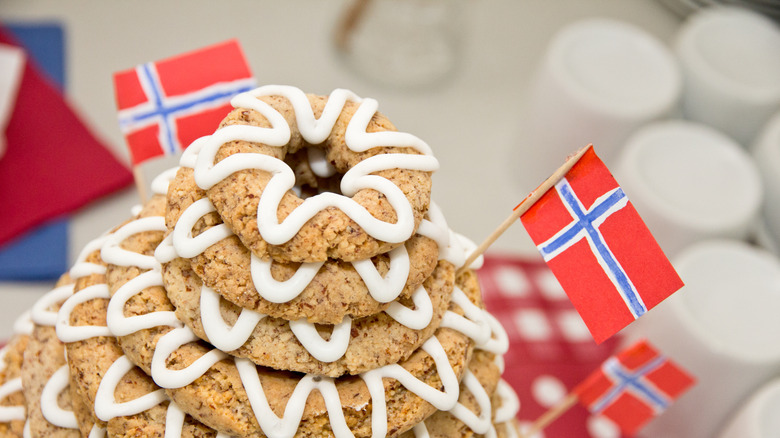 If you've ever attended a Norwegian wedding or Christmas party, you might have seen a towering, layered cake in the corner, decorated with Norwegian flags. It's called a kransekake, and it's traditionally served at celebrations across Norway (and other countries across Scandinavia). A kransekake consists of several almond ring cakes stacked on top of each other and decorated with icing or frosting.