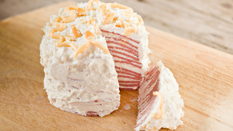 If ever there were a dish that could give the Jell-O salad a run for its money on the retro distaste list, it's the bologna cake. Also known as a baloney cake (not that it makes it sound any more delicious), this dish is made up of slices of bologna that are stacked and layered with cream cheese. To give it some flair, various toppings were then added to the dish.