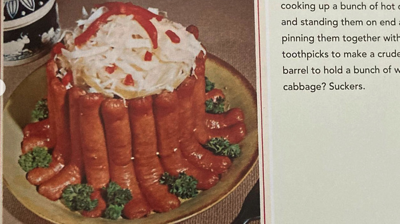 While the crown roast of frankfurters was considered a centerpiece in the late 1960s, that time has thankfully passed. Another recipe introduced to the world by a popular weight loss program, this retro dish first appeared in a recipe book in 1969. While the book seems to try its best to make frankfurters and hot dogs look highbrow, they didn't fool us.