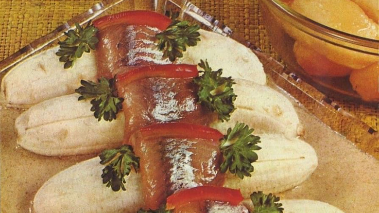 Another retro dish that we hope is never placed before us combines the contrasting flavors of banana and pickled herring. Yes: This was actually a thing. In fact, a German cookbook from 1963 featured a banana herring recipe that combined herring fillets, banana, cream, mayonnaise, paprika, and mustard.