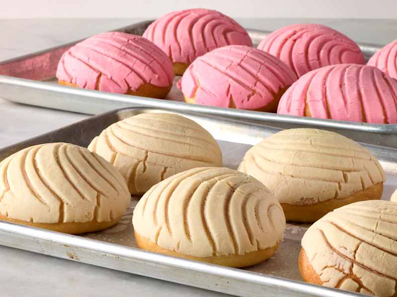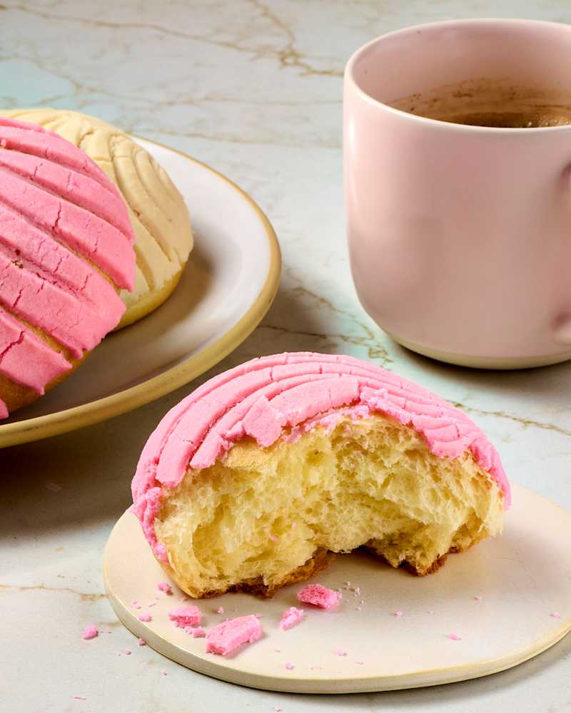 Mexican conchas are slightly sweet, incredibly fluffy, and brilliantly vibrant; you'll often see them in the colors white, pink, and dark brown (for chocolate). Their texture is what makes them so special. Soft, moist, and fluffy, the interior resembles challah or brioche. The outside is topped with a sweet streusel-like topping that is draped over the bun and scored in the traditional concha pattern, which gives it its iconic shell-like look. They are delicious on their own, dipped in a cup of chocolate Abuelita (a nostalgic hot chocolate brand often found in Mexican grocery stores or bodegas lightly spiced with cinnamon and other flavors) or cafe de olla (black coffee brewed together with pilloncillo and cinnamon). These delectable buns are unmistakable - and let me be the one to say they make for the perfect ice cream vessel (think: a concha ice cream sandwich). So whether you grew up with them or are trying them on your own for the first time, these sweet buns are not to be missed.