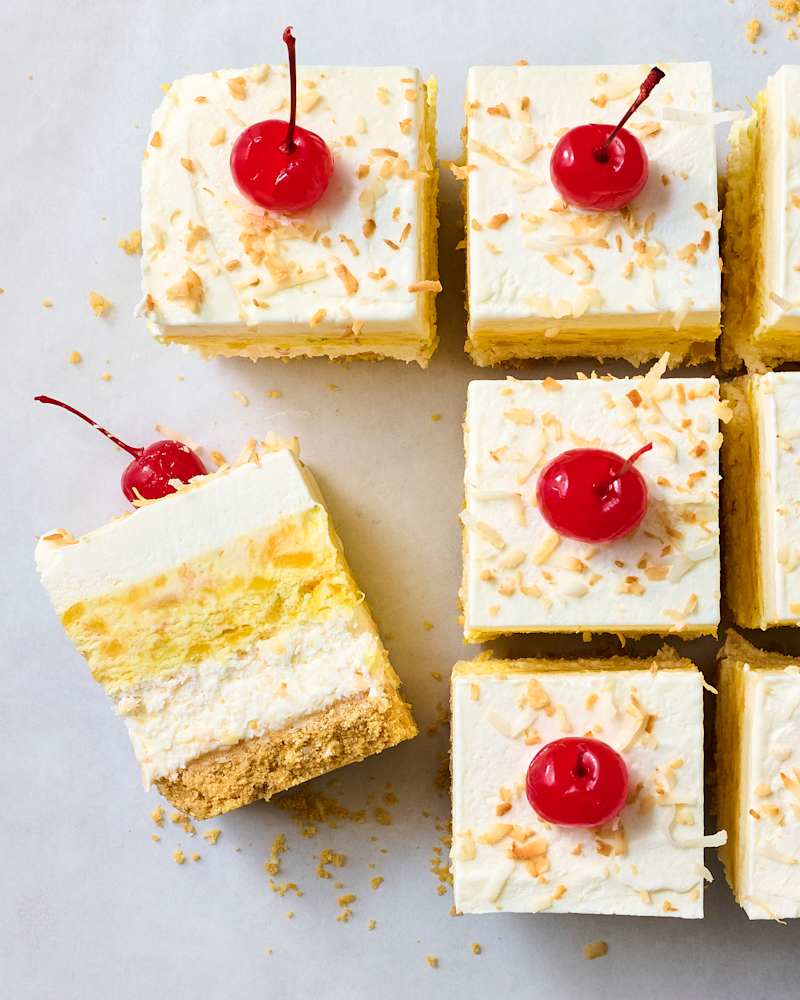 When ready to serve, sprinkle the remaining 1/3 cup toasted shredded coconut over the top. Grasping the excess parchment, lift the slab out of the pan and place on a cutting board. Cut into 16 pieces, wiping the knife between each cut for the cleanest-looking slices. Garnish each slice with a maraschino cherry if desired.