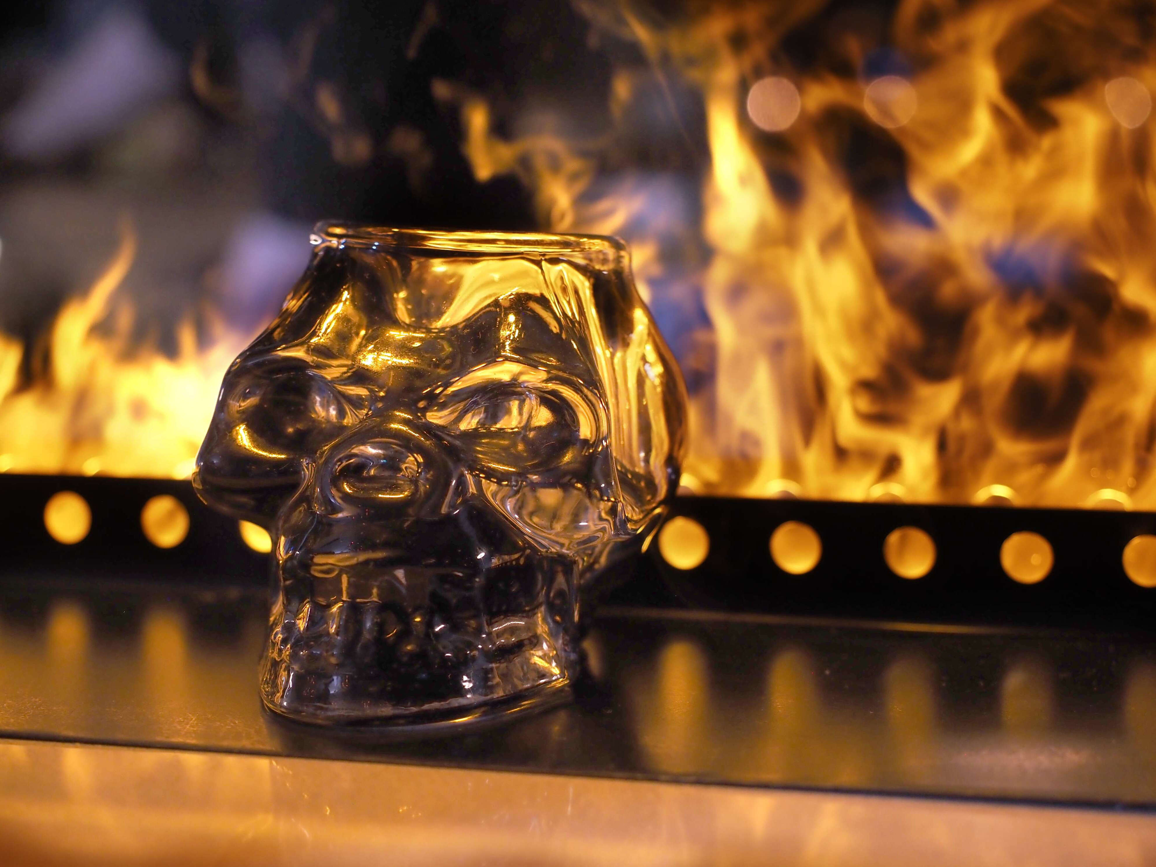 The two rooms are separated by the bar that has a flame-like water vapor effect on the counters, making it look like guests are eating on fire.