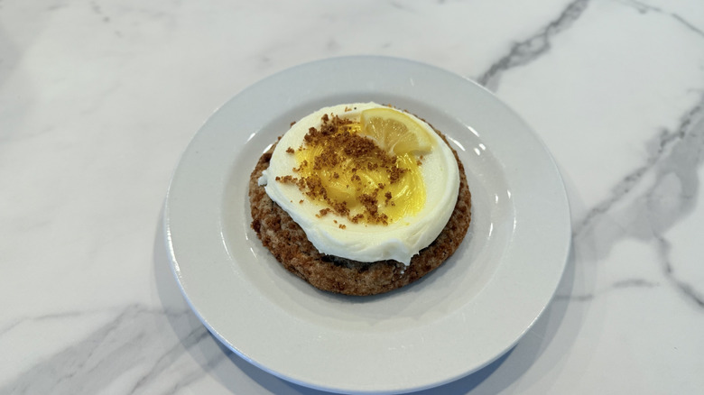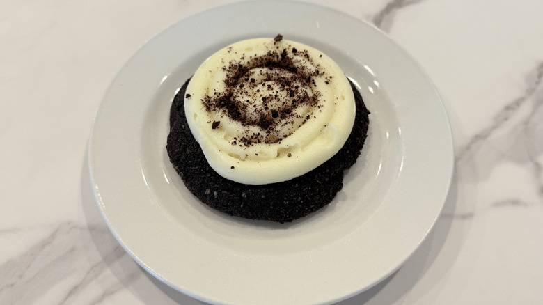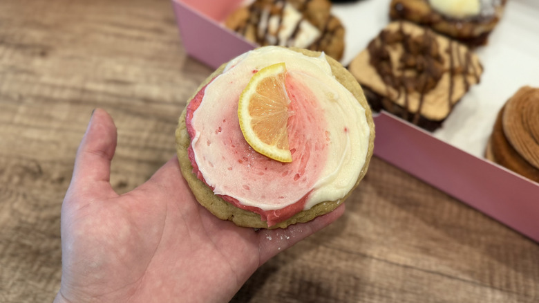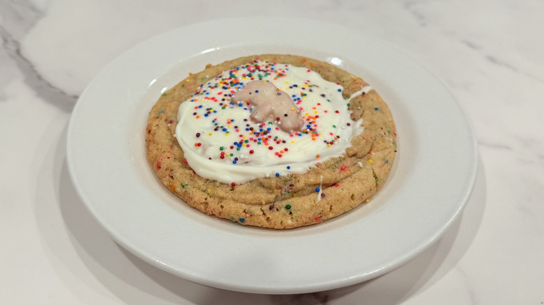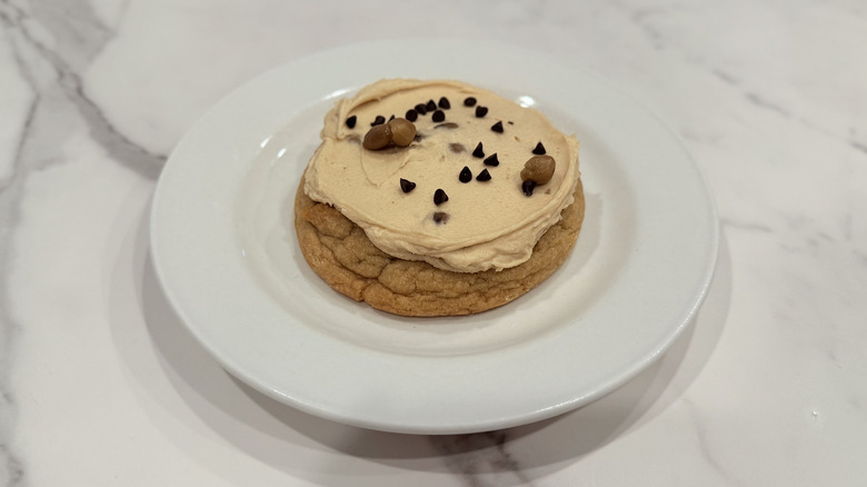 The cookie was a brown sugar cookie with cookie dough frosting and bits of cookie dough sprinkled on top — the kind you find mixed into cookie dough ice cream. Though I was skeptical, the degree to which that cookie frosting tasted exactly like real, raw cookie dough was astounding. The brown sugar cookie on the bottom tasted like a chocolate chip cookie without the chocolate chips, and the whole experience had a slight nuttiness too. This was the ideal cookie for cookie lovers and cookie dough risk-takers alike. While it's regretfully unsafe to enjoy raw cookie dough, this cookie was a great substitution. Crumbl has some wild ideas that aren't always amazing in execution -- but this wild idea is unforgettably tasty.