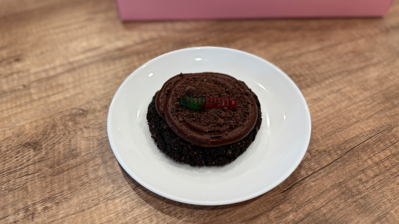 Of the three notable kids' cookies I sampled across the weeks, the dirt cake cookie was easily my favorite. Inspired by the classic dessert meant to look like dirt, often including charming gummy worms, the cookie took on a similar look. It included a chocolate base with chocolate frosting on top and chocolate crumbles to finish it off. Each cookie also had a gummy worm, of course.