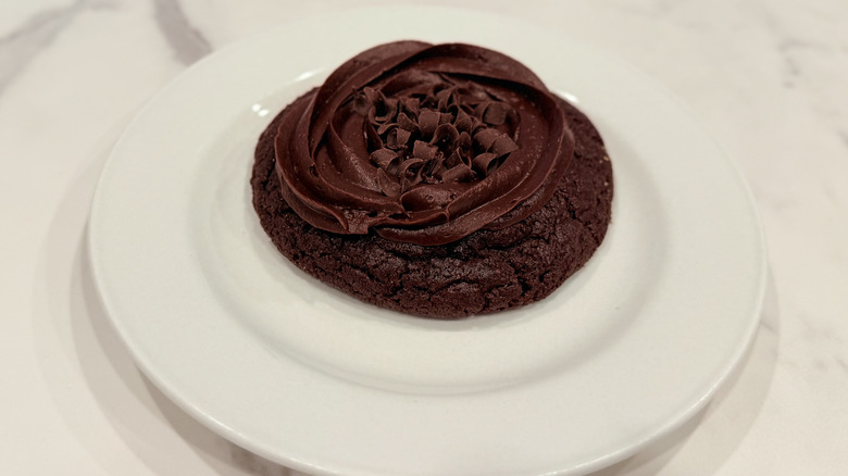 Unfortunately, after a few bites I found the frosting may have been a little too sweet, nearly teeth chattering so. I couldn't eat more than a quarter of the cookie at a time, even if it offered a satisfying bite. I also wished that the cookie hadn't been so crumbly. The crumb makes sense for the topping of the frosting. But the chocolate cookie itself felt more crumbly, and that gave the whole thing a less cohesive bite -- like eating smashed together crumbs rather than a whole, solid cookie.