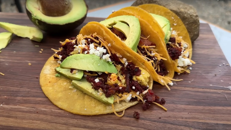 Anyone can make tacos using soft or hard tortilla shells and anything they have in the fridge that can be chopped and goes well with a corn tortilla. Kent Rollins' breakfast version consists of scrambled eggs, bacon and chorizo, and shredded cheese in a soft tortilla warmed in bacon grease. It's so easy to cook and put together, but Rollins goes the extra mile by making sure the eggs that go into his breakfast tacos are the "fluffiest eggs ever."
