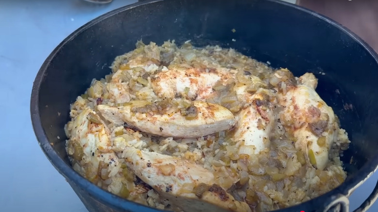 Another chicken dish that Kent Rollins learned from his mother is chicken and rice casserole. He learned to cook it when he was between 10 and 11 years old. He remembers having it on the table at dinner whenever the weather is cold, surely a most welcome sight after being on horseback and working outdoors all day. "Mama would put this out there on some of that old CorningWare, that casserole dish , and lay it on the table," he tells his YouTube audience. "We had blessed the food and ate it. And to me, there's nothing more special than that moment growing up because there was all the family there."