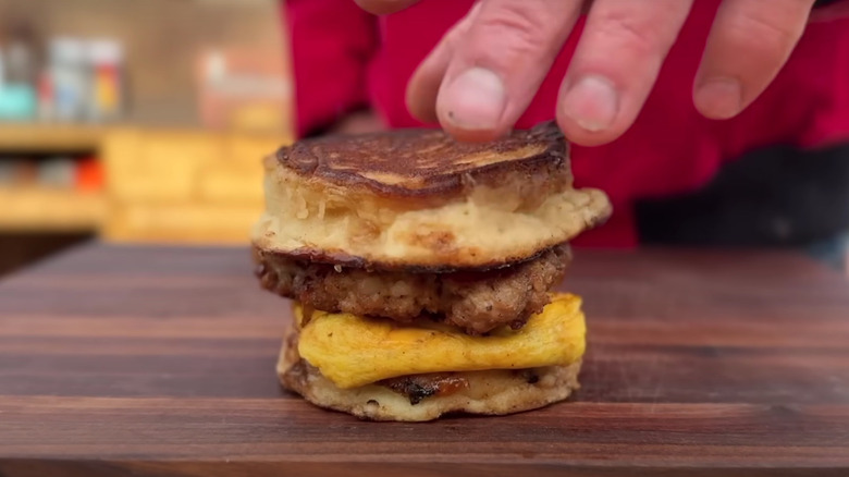 Fun fact: Kent Rollins hadn't had a McGriddle until he had to taste one to try and recreate it to satisfy a cowboy's appetite. He found it good enough for a breakfast waffle, but there were areas of improvement that would make it more satisfying to grown men with a full day's work ahead of them — starting with the sausage patty. Rollins' homemade patties are easily ¾ of an inch thicker and juicier than the rather flat one by McDonald's. He also made them bigger, so one could take a full bite and still have a lot left to sink their teeth into.